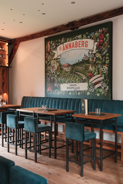 Die Weinlounge „355 NN“ vom Weingut Sankt Annaberg ist auch im Herbst und Winter die perfekte Adresse. In entspannter Atmosphäre können die Weine von Sankt Annaberg verkostet werden, während man original Pfälzer Kleinigkeiten aus der Metzgerei Kieffer in Bad Bergzabern zu sich nehmen kann. Die weitläufige Terrasse mit Blick in die Rheinebene bietet den idealen Rahmen, um den Tag ausklingen zu lassen und den Weingenuss voll auszukosten.